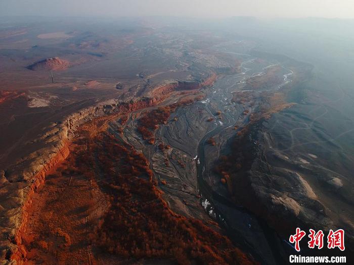 黑色的第四纪沉积物覆盖第三纪的红色泥岩,经河水冲刷后红黑分明。 李靖海 摄