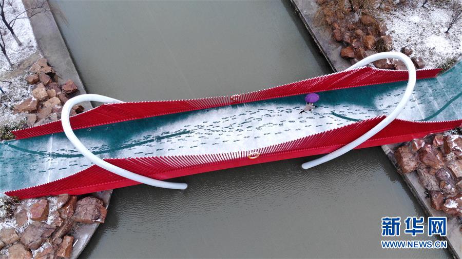 1月9日,游客在翡翠湖风景区漫步(无人机照片)。 1月8日夜间,合肥市迎来2020年的首场降雪。雪后的合肥市翡翠湖风景区银装素裹,景色如画。 新华社发(黄博涵摄)