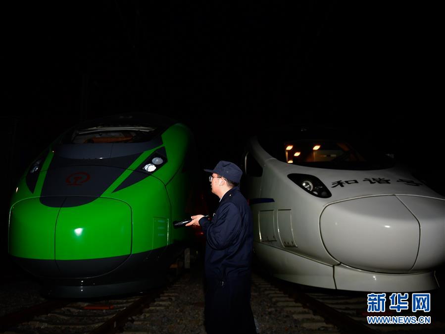 地勤机械师谭旭准备前往下一列动车巡查(1月8日摄)。 谭旭是青藏铁路公司西宁车辆段动车运用车间的一名地勤机械师,他的工作被称为“打温人”。每年冬季,为防止高原动车组发生冻车问题,青藏铁路公司都要安排专人对动车组进行升弓、打温作业。 夜里8点,谭旭开始一天的工作,在工作的12个小时里,他要每隔2小时,对库内动车的设施设备进行巡视检查,控制车厢供电设施,维持车厢温度不低于18摄氏度。寒冬午夜,动车“打温人”彻夜不眠,穿梭在一辆辆动车间巡查,为动车组“驱寒保暖”。 新华社记者张龙摄