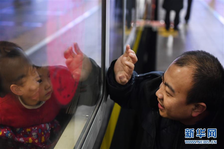 1月10日,在北京火车站K4051次列车前,送别家人的王长付(右)向车内的3岁女儿招手。 当日,2020年春运正式启动。 新华社记者 鞠焕宗 摄