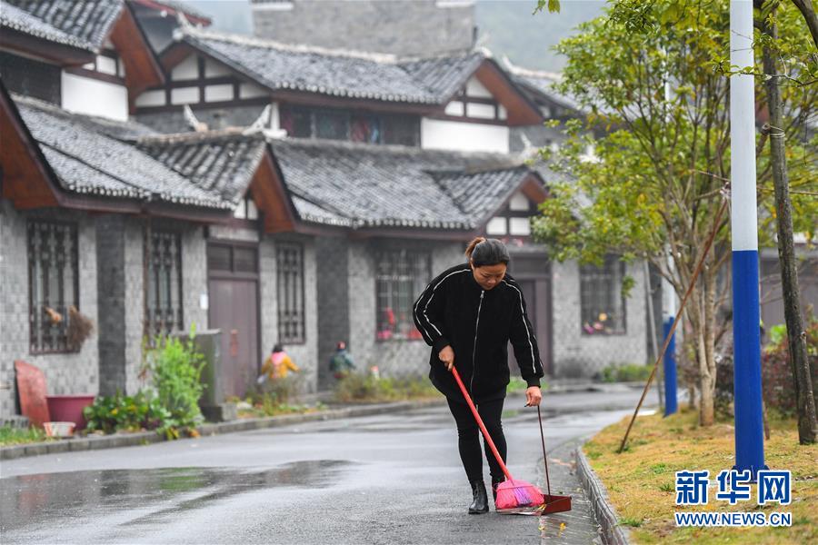 向梅在坪朗安置点清扫路面(1月8日摄)。新华社记者 陈泽国 摄