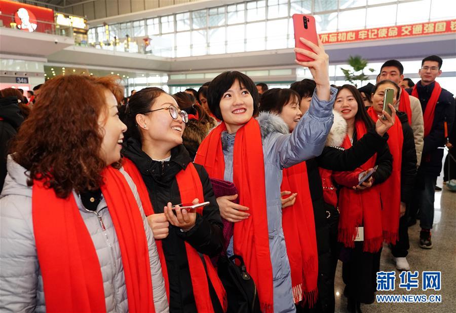 1月10日,青年务工者在西安北站候车大厅自拍留念。新华社记者 邵瑞 摄