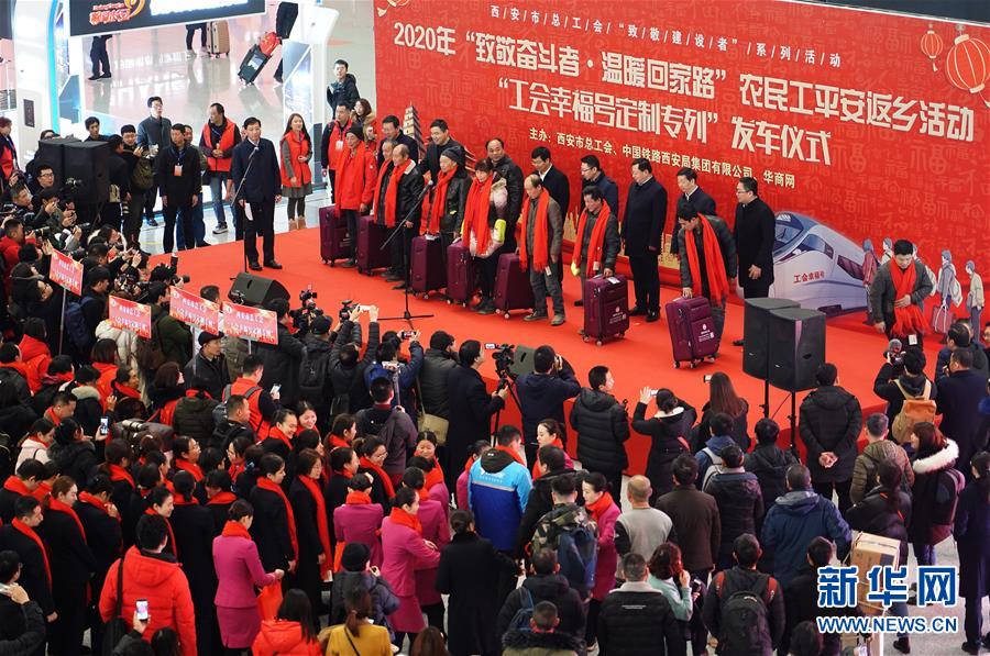 1月10日,农民工在“工会幸福号定制专列”发车仪式现场领取新春礼包。新华社记者 邵瑞 摄
