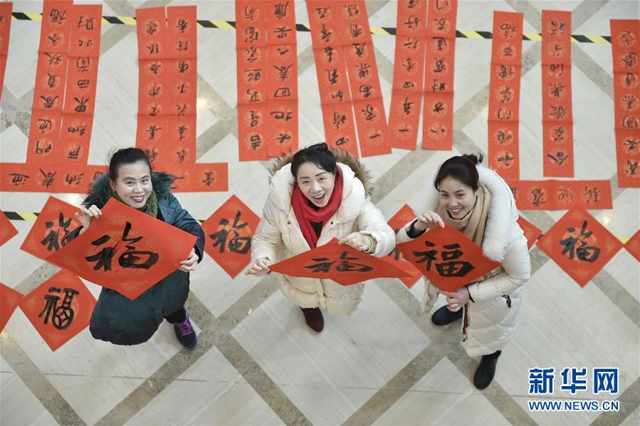 1月10日,市民在活动现场展示领取的福字。 当日,河北省固安县文化馆举办迎新年书画笔会暨送春联送福字进万家活动,邀请当地的书法家和书法爱好者为群众免费书写春联和福字,喜迎新春佳节。 新华社记者 鲁鹏 摄