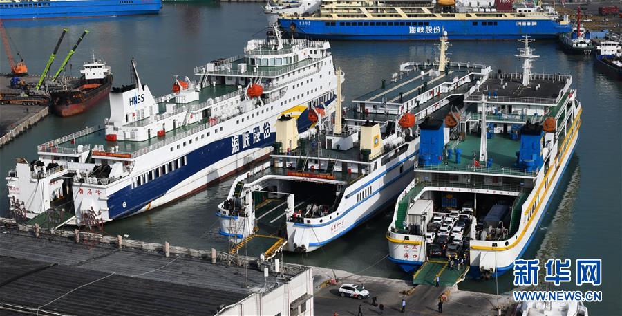 1月10日,在海口市秀英港轮渡码头,客滚船等待出航。 当日,2020年春运拉开帷幕,在40天时间里,中国预计有30亿人次出行。 新华社记者 杨冠宇 摄