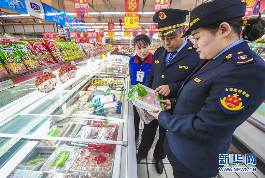 1月10日,河北省阜城县市场监督管理局的工作人员在一商场查看肉食类产品的冻储日期。 春节临近,河北省阜城县加大市场监管力度,集中开展春节前食品安全执法检查,保障民众“舌尖上的安全”,确保群众度过一个欢乐祥和的春节。 新华社记者 李晓果 摄