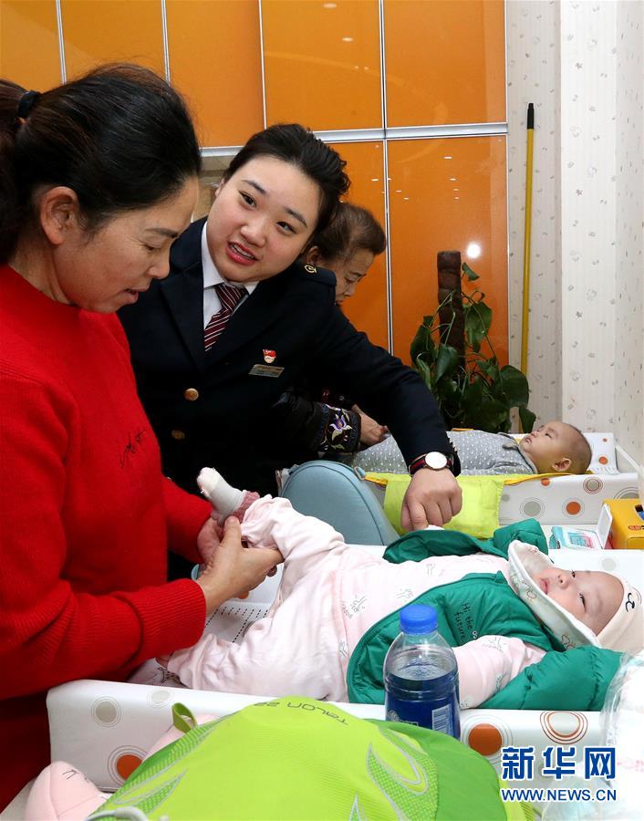 1月10日,上海虹桥火车站“心尚雷锋服务站”员工在母婴候车室协助旅客照顾婴儿。 当日,2020年春运正式启动,众多小朋友也踏上旅途。 新华社记者 陈飞 摄