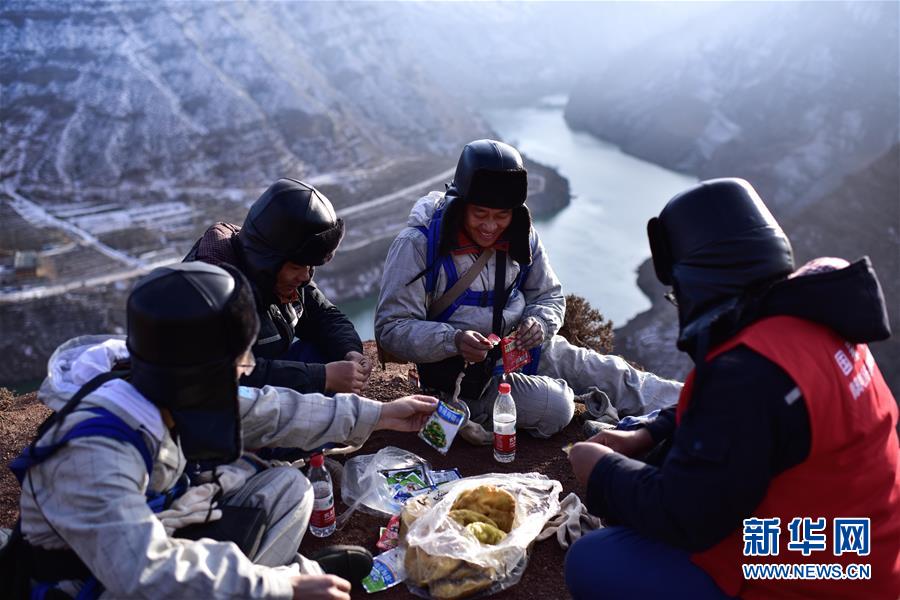 王清波(右一)和同事们在巡线途中吃饭(1月7日摄)。 新华社记者 吴刚 摄