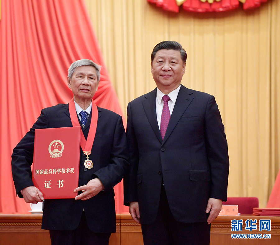 1月10日,2019年度国家科学技术奖励大会在北京人民大会堂隆重举行。中共中央总书记、国家主席、中央军委主席习近平向获得2019年度国家最高科学技术奖的中国科学院大气物理研究所曾庆存院士颁奖。 新华社记者 李学仁 摄