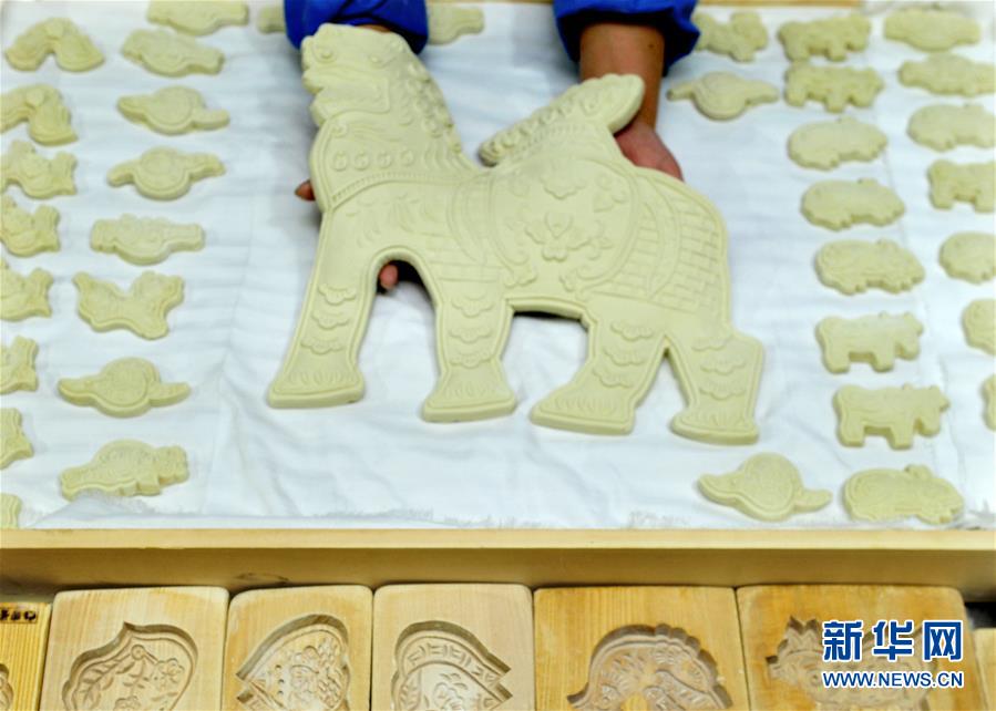 河北省黄骅市一家面花制作工厂的工人在展示铁狮子造型面花(1月10日摄)。河北省黄骅市有着过年蒸面花的习俗,随着春节临近,黄骅市的面花制作工厂加班加点制作面花,供应春节市场。黄骅面花是一种用模子塑形加工后蒸制的面食,历史悠久,造型美观。2009年,黄骅面花制作技艺被列入河北省非物质文化遗产名录。新华社记者 牟宇 摄