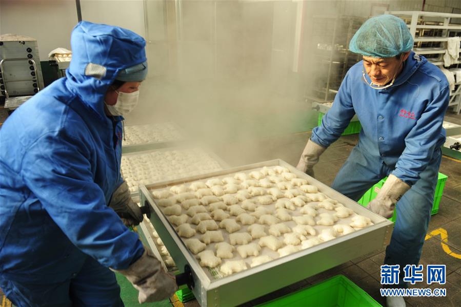 河北省黄骅市一家面花制作工厂的工人在搬运蒸好的面花(1月10日摄)。河北省黄骅市有着过年蒸面花的习俗,随着春节临近,黄骅市的面花制作工厂加班加点制作面花,供应春节市场。黄骅面花是一种用模子塑形加工后蒸制的面食,历史悠久,造型美观。2009年,黄骅面花制作技艺被列入河北省非物质文化遗产名录。新华社记者 牟宇 摄