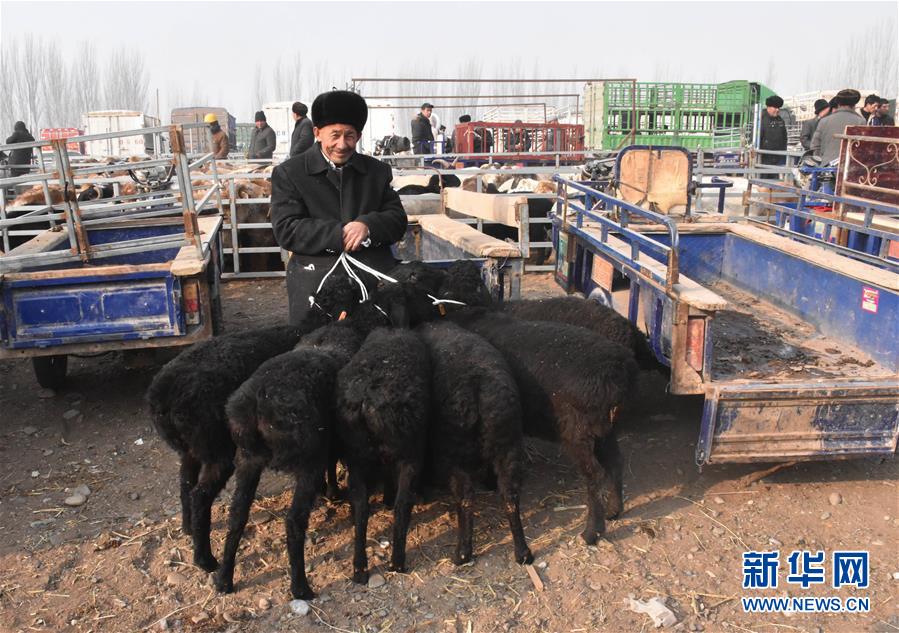 在新疆喀什“牛羊巴扎(集市)”,一名老人牵着买到的羊(1月5日摄)。新华社记者 史先涛 摄