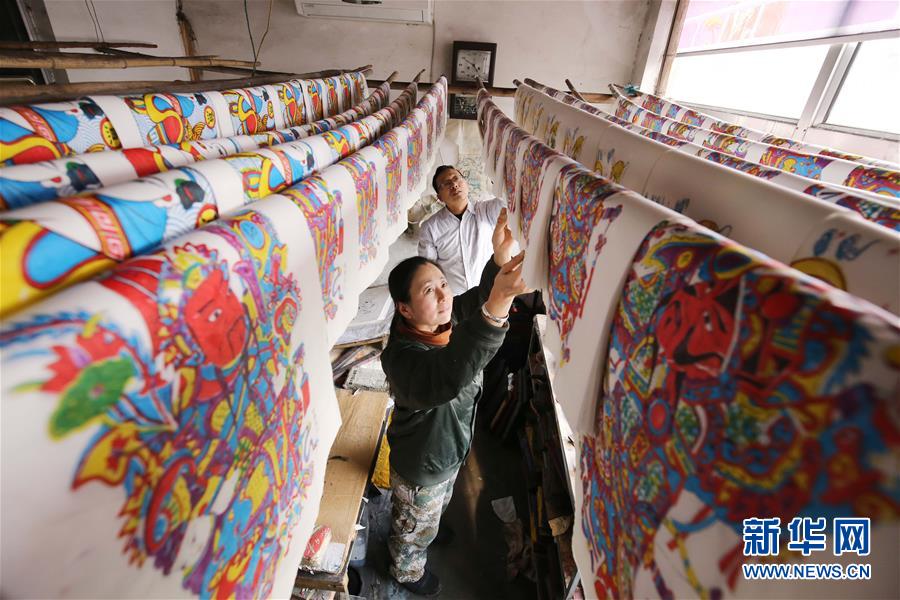 1月11日,山东省潍坊市寒亭区杨家埠村年画艺人在晾晒刚刚印制好的木版年画。 春节临近,在素有“年画之乡”美誉的山东省潍坊市寒亭区杨家埠村,年画艺人们忙着印制木版年画,以供应节日市场。 新华社发(张驰 摄)