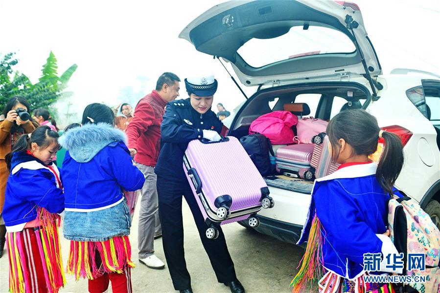 1月11日,在贺州市平桂区鹅塘镇明梅土瑶村,交警帮助安全到达的学生搬运行李。 新华社发(黄旭胡 摄)