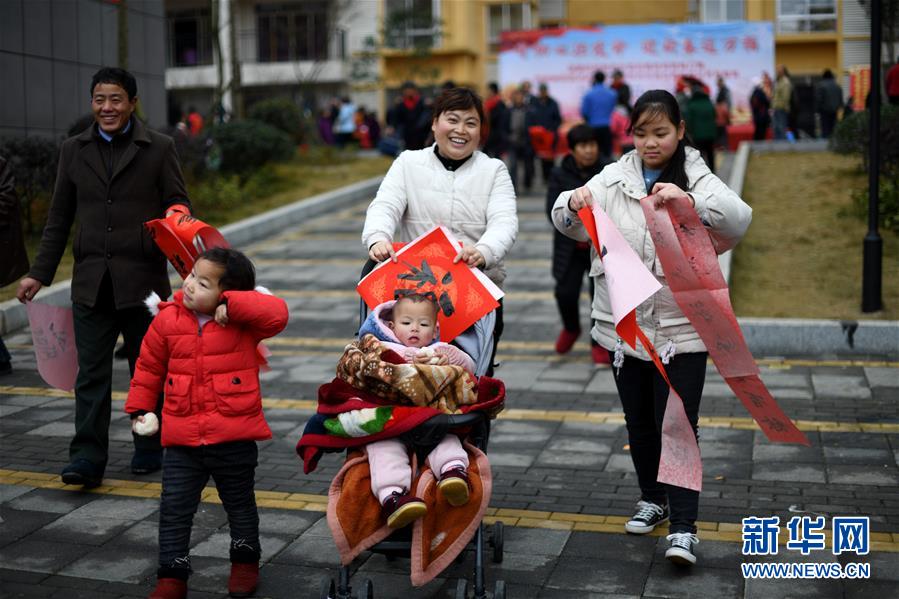 1月11日,福泉市乐岗五新社区居民领到书法家书写的春联。 当日,贵州省福泉市易地扶贫搬迁安置区——乐岗五新社区开展“守初心担使命 迎新春送万福”活动,百名书法家走进社区为群众免费写春联。 新华社发(吴儒波 摄)