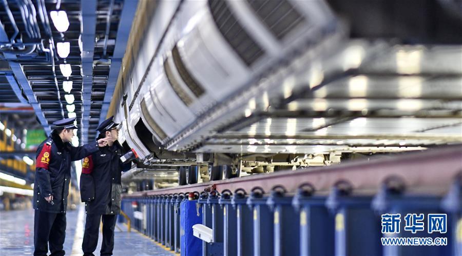 1月12日凌晨,蒋鹏(右)和田永刚在巡查检修基地。 新华社记者 李欣 摄