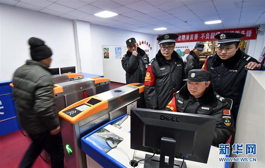 1月12日凌晨,蒋鹏(左三)和田永刚(右)在检查基地内维修车间的安检设备。 新华社记者 李欣 摄
