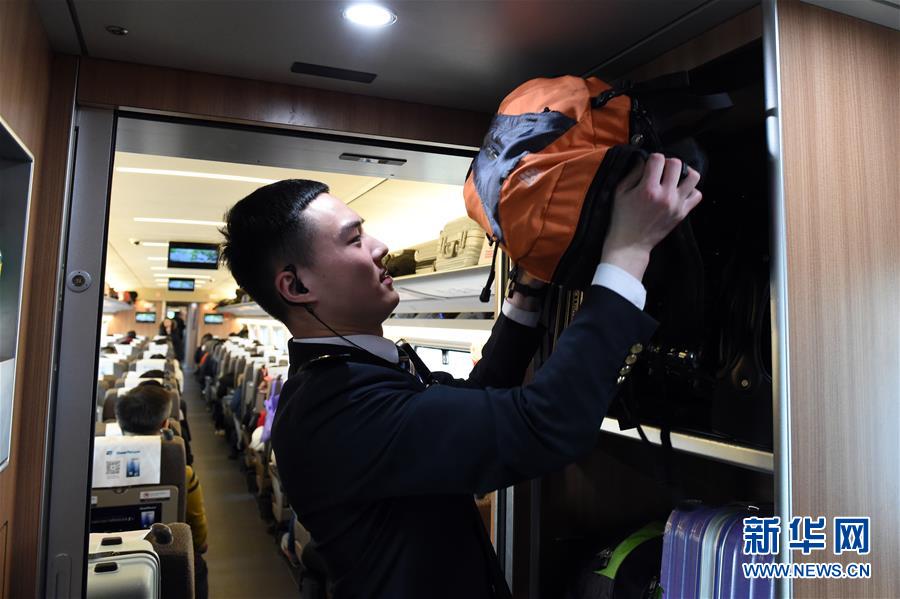 1月12日,在G24次列车上,乘务员刘恒多在列车内查验车票。新华社发(周牧 摄)