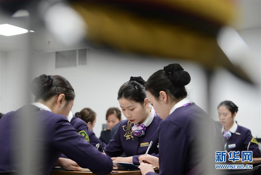 1月12日,乘务员刁雨婷、李新妍、王雨昕(从左至右)在合肥南站参加早会。新华社记者 韩晓雨 摄