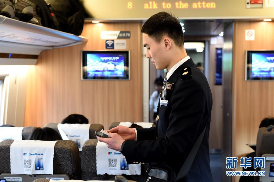 1月12日,在G24次列车上,乘务员王雨昕在整理行李架。新华社发(周牧 摄)