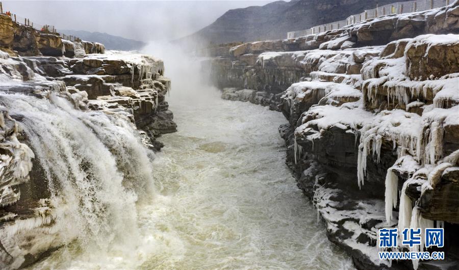 1月12日,黄河壶口瀑布景区内的冰瀑与流动的瀑布形成一幅独特的景观(无人机照片)。 隆冬时节,位于晋陕交界的黄河壶口瀑布飞溅的浪花在瀑布两岸岩石上凝结形成冰瀑冰雕,成为冬季壶口瀑布景区一道奇特的景观,吸引游人前往观赏。 新华社记者 陶明 摄