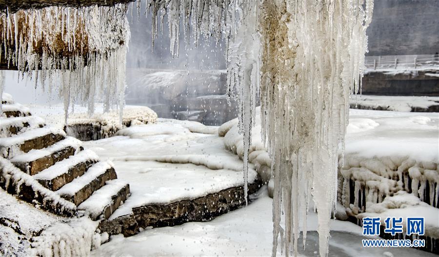 1月12日拍摄的陕西黄河壶口瀑布景区内“冰峰倒挂”景观。 隆冬时节,位于晋陕交界的黄河壶口瀑布飞溅的浪花在瀑布两岸岩石上凝结形成冰瀑冰雕,成为冬季壶口瀑布景区一道奇特的景观,吸引游人前往观赏。 新华社记者 陶明 摄