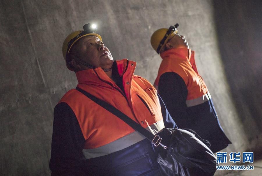 通化通信车间无线工区铁路通信工人观察隧道顶部通信线缆是否有外露情况(1月10日摄)。 2020年春运1月10日拉开帷幕。无数旅客平安出行的背后,是无数基层铁路工人的付出和坚守,中国铁路沈阳局集团有限公司吉林电务段通化通信车间无线工区的铁路通信工人便是其中之一。他们在长白山区饮风踏雪,为保障辖区隧道内铁路通信信号传输全天候畅通而日夜奔行。 新华社记者 许畅摄