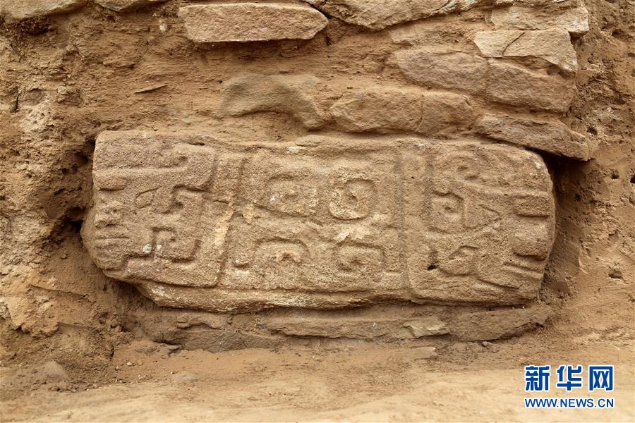这是陕西石峁遗址皇城台大台基南护墙出土的石雕(2018年6月16日摄)。新华社发