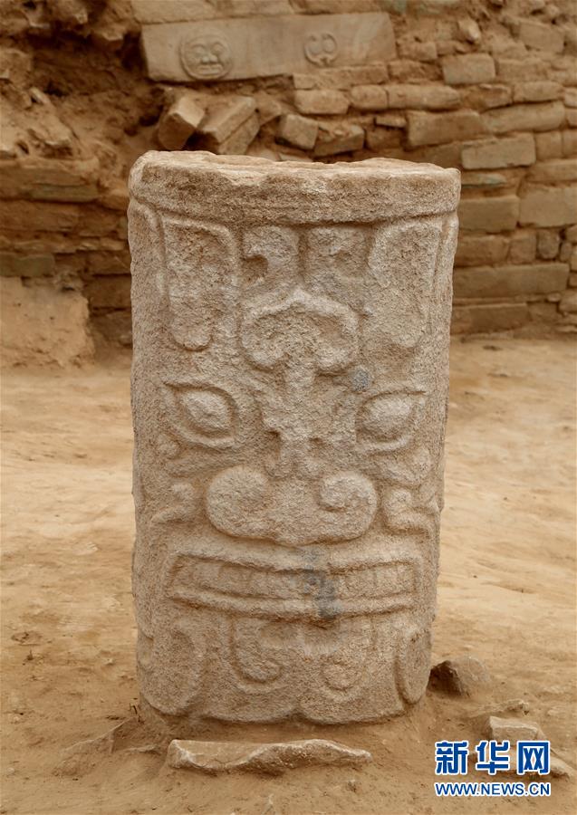 这是陕西石峁遗址皇城台大台基南护墙出土的石雕(2019年5月14日摄)。新华社发