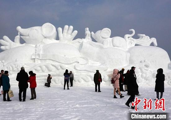 新疆博湖大型冰雪雕吸引众多游客前来欣赏