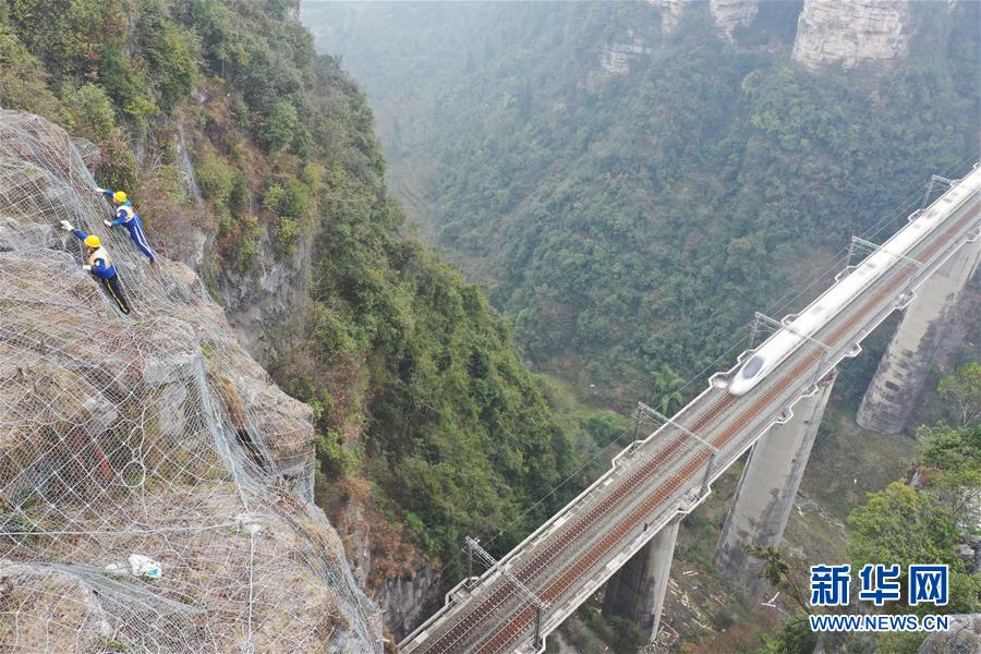1月13日,在宜万铁路堰湾隧道上,巡山工对隧道上方山体进行巡查(无人机照片)。 春运期间,宜万铁路运输繁忙,中国铁路武汉局集团有限公司宜昌综合维修段的巡山工每天要攀爬于宜万铁路沿线的崇山峻岭之间,巡查、排除危石、危树等安全隐患,为春运保驾护航。 新华社发(彭琦 摄)