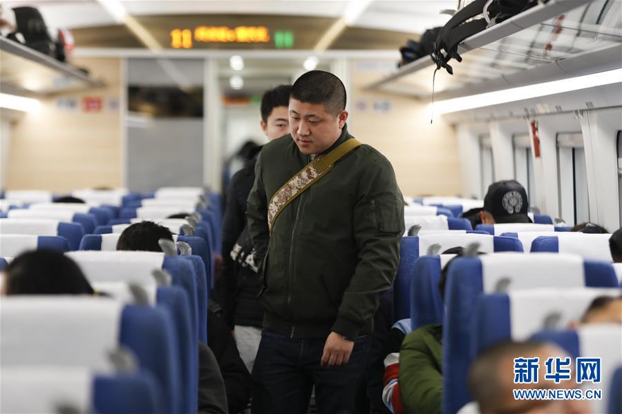 1月13日,杨光超在重庆北站即将出发的列车上进行票源核查。 新华社发(黄伟 摄)