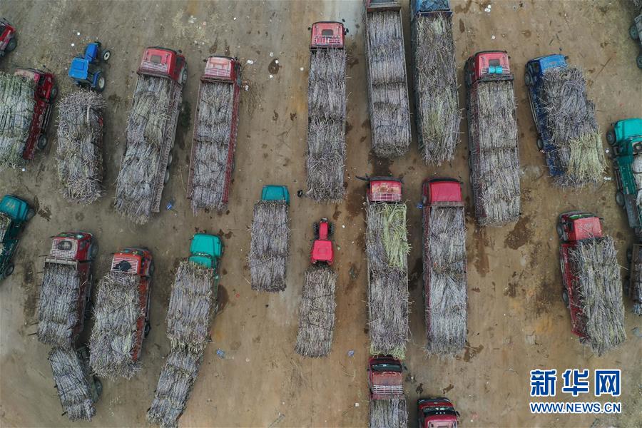 1月13日,运蔗车辆排队进入鹿寨县一家制糖企业(无人机照片)。新华社记者 黄孝邦 摄
