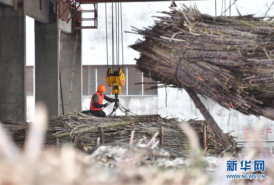 1月13日,鹿寨县一家制糖企业工人将甘蔗卸下。新华社记者 黄孝邦 摄