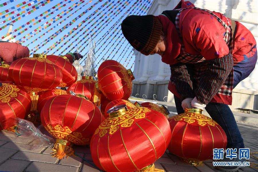 1月13日,工作人员在白塔寺灯会现场准备架设红灯笼。新华社记者 马宁 摄