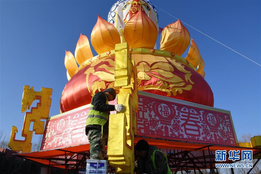 1月13日,工作人员在白塔寺灯会现场布置彩灯。新华社记者 马宁 摄