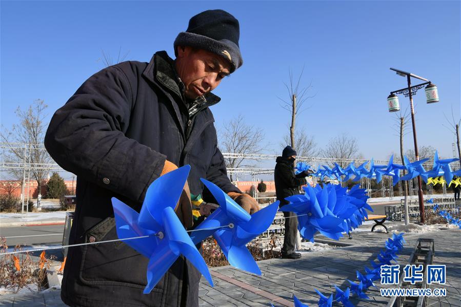 1月13日,工作人员在白塔寺灯会现场布置风车。新华社记者 马宁 摄
