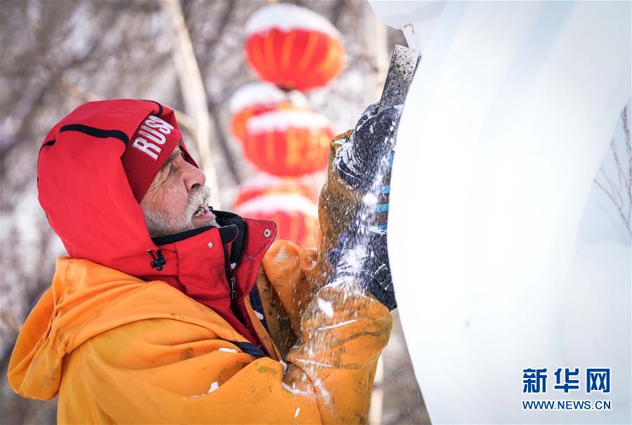 1月13日 ,参赛选手在哈尔滨太阳岛雪博会园区创作雪雕。新华社记者 王松 摄