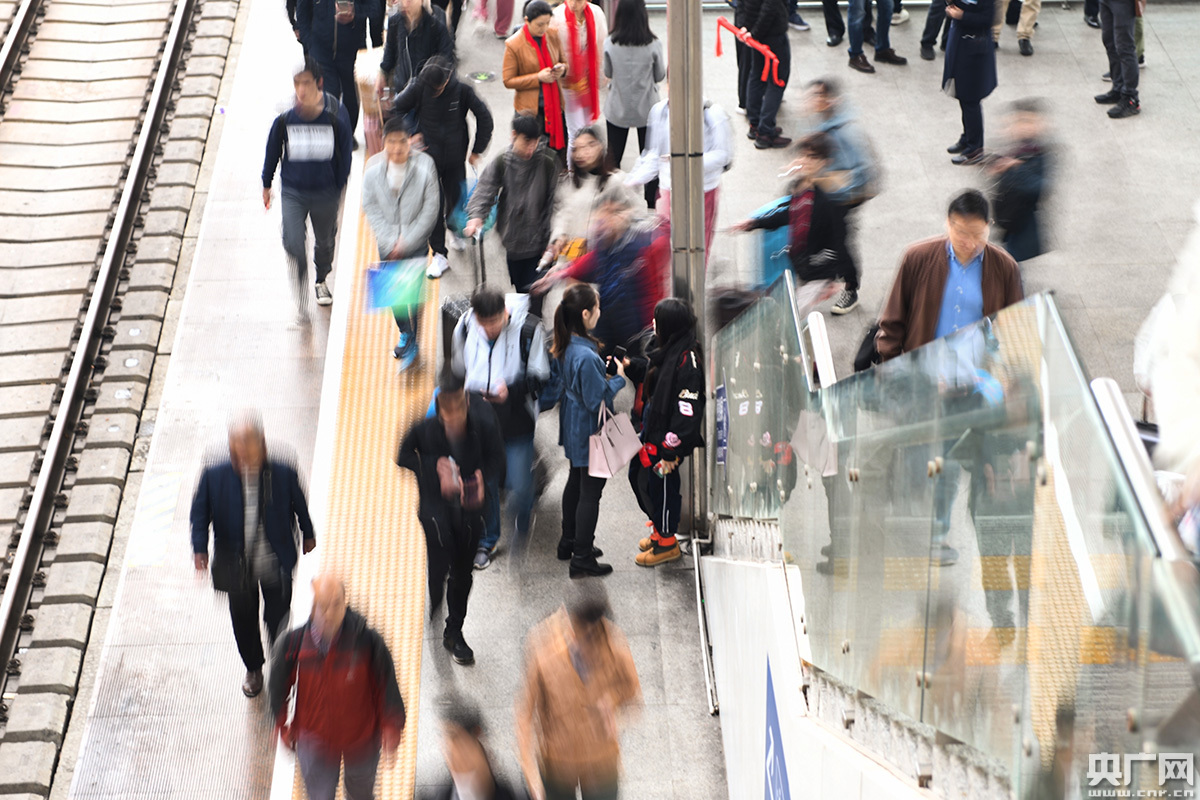 人流中,两名少女成了站厅中最安静的画面。(央广网记者 官文清 摄)