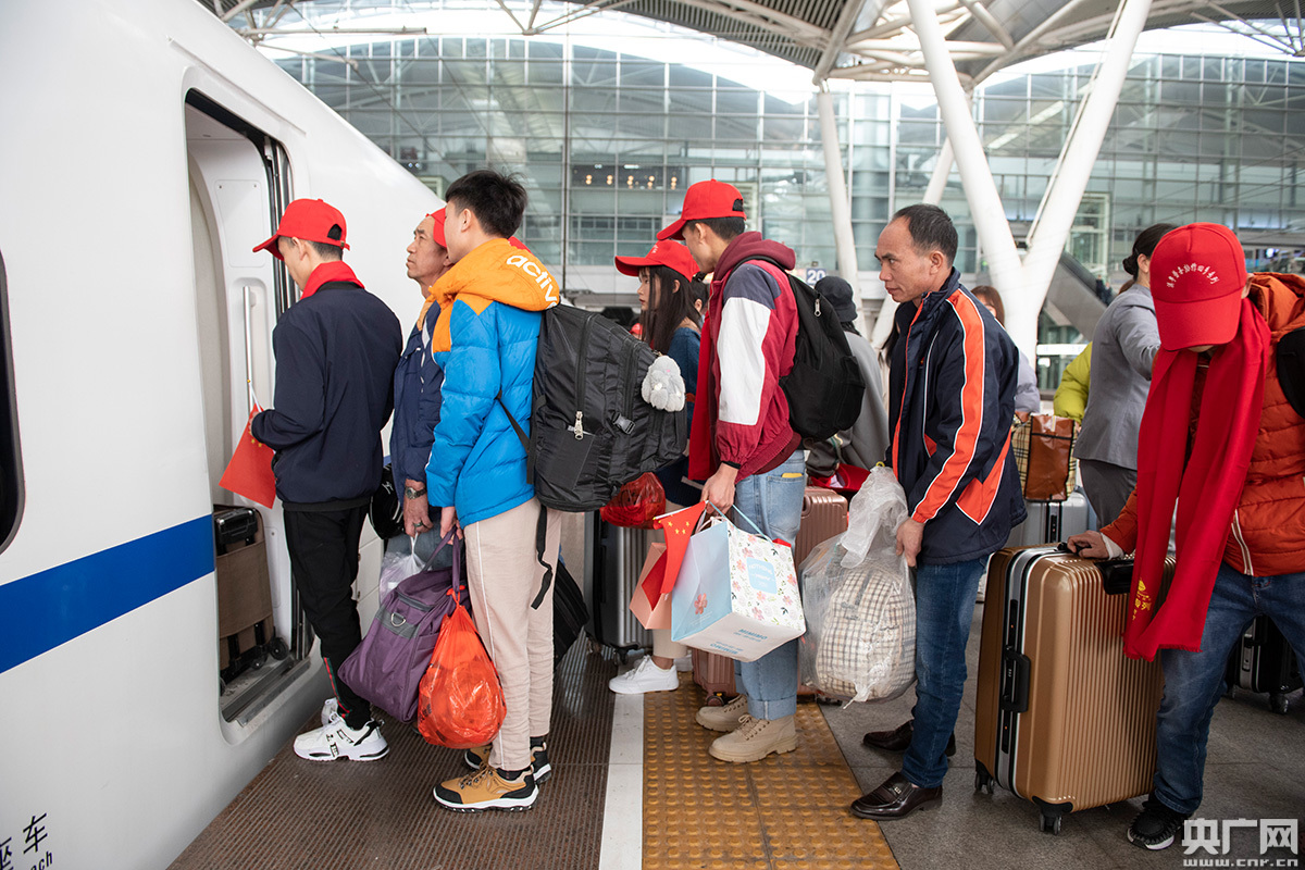 外来务工人员排队上车,准备踏入返乡旅程。(央广网记者 官文清 摄)