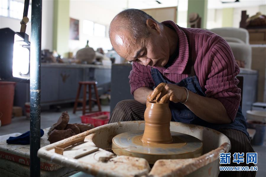 1月13日,陈金旺在窑谷工作室制作陶器茶具。新华社记者 金立旺摄