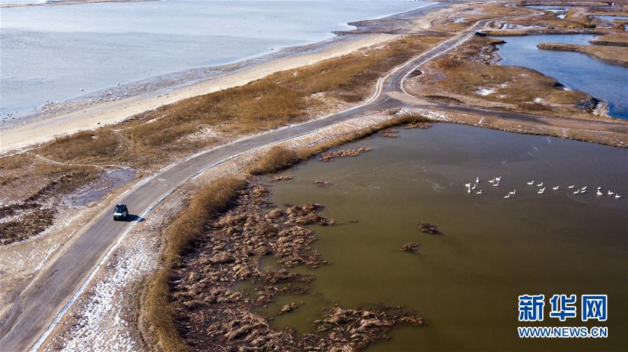 在荣成大天鹅国家级自然保护区天鹅湖管理站,刘志斌在开车巡查(无人机照片,1月9日摄)。新华社记者 侯东涛 摄
