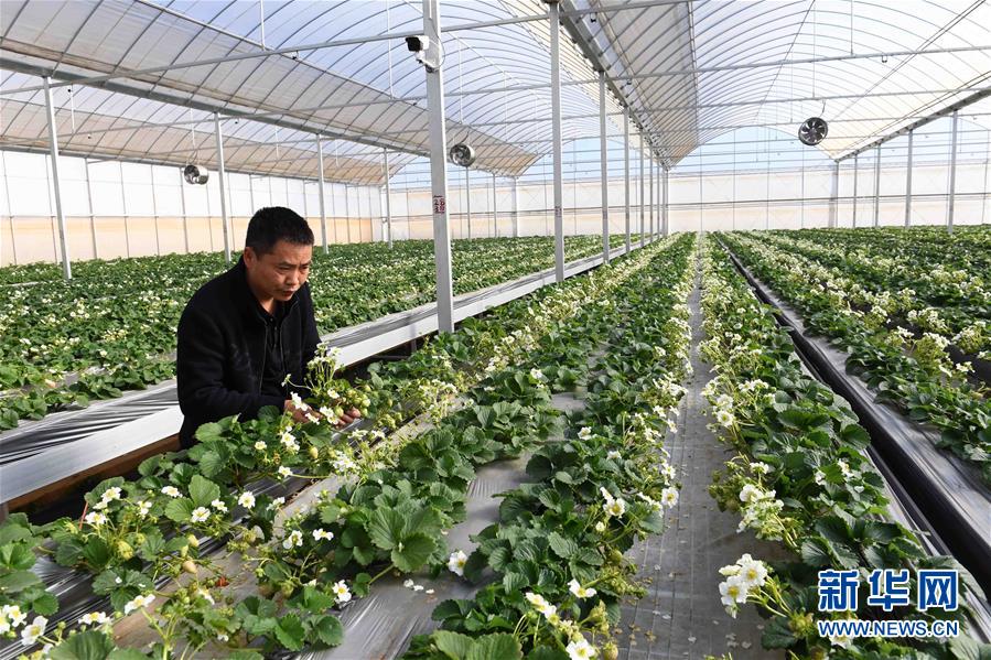 1月13日,管理人员在法祖屋村草莓育苗基地查看苗种。新华社记者杨宗友 摄