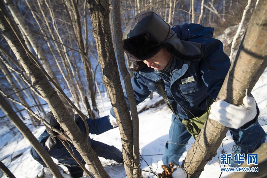 1月13日,宏伟线巡线路上,冯东海(前)拉着孟祥斌爬上山坡。新华社发(张涛 摄)