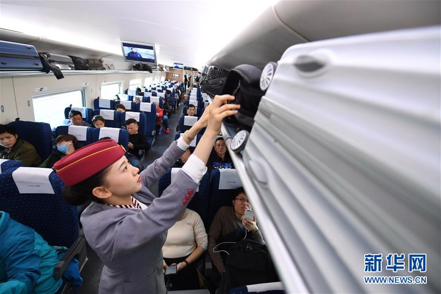 1月14日,南昌铁路局福州客运段列车长樊思萱在动车上整理行李。新华社记者 林善传 摄