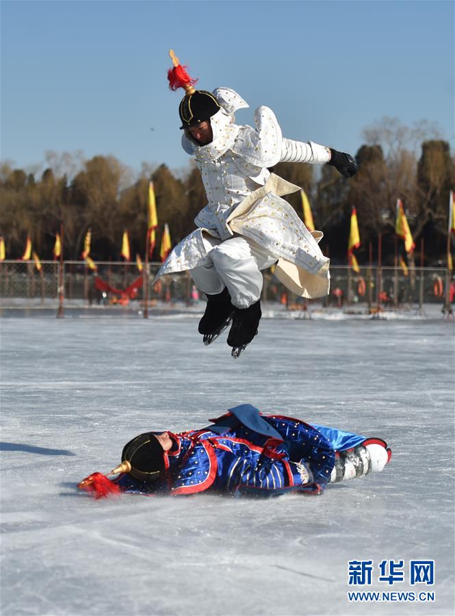 1月14日,表演者在北京北海公园冰面上展示冰上跳跃技巧。 当日,北京北海公园举行“冰嬉”表演。“冰嬉”是我国传统冰上运动,北海曾是清代“冰嬉”表演的重要场所之一。 新华社发 (陈钟昊 摄)