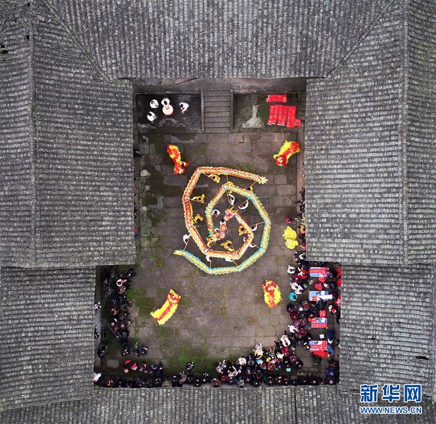 1月13日,在四川省南充市蓬安县睦坝镇瓦店村王家大院,文化志愿者为当地群众表演舞龙舞狮(无人机照片)。 当日,由四川省南充市蓬安县文化志愿者组成的文化下乡小分队来到睦坝镇瓦店村王家大院,为当地群众进行变脸、舞龙舞狮等群众喜闻乐见的文艺表演,把精神食粮送到老百姓家门口,共迎新春。 新华社发(刘永红 摄)