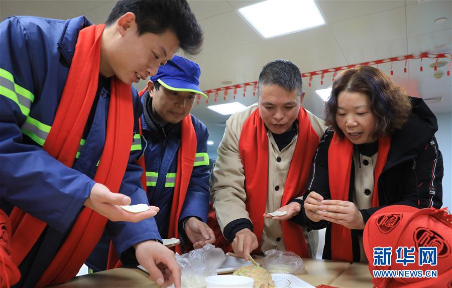 1月14日,环卫职工(左一、左二)和家政服务员在联谊活动现场包饺子。新华社记者 方喆 摄