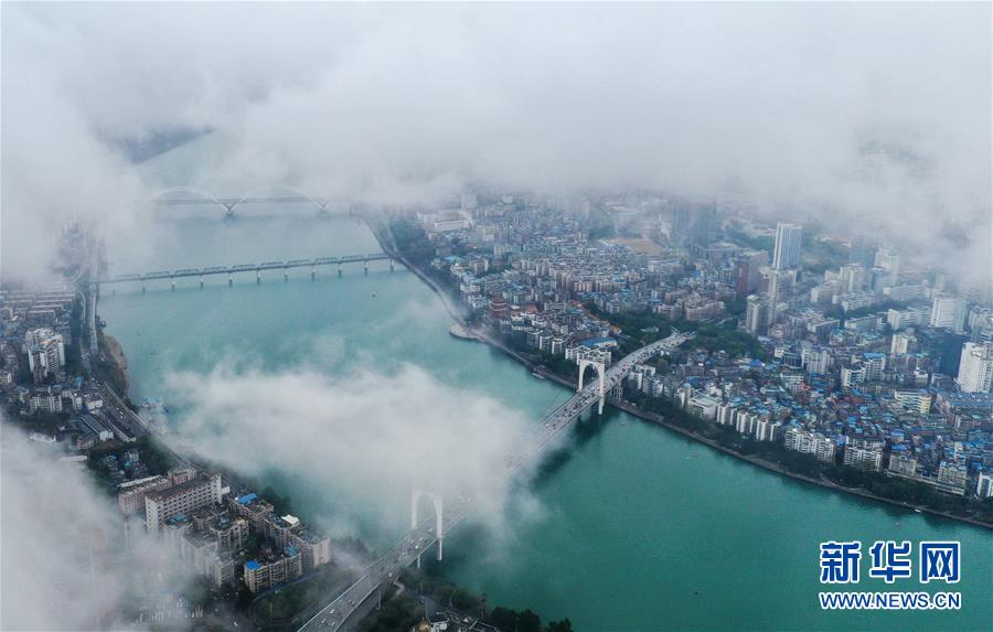 1月14日,一场冬雨过后,广西柳州柳江两岸云雾升腾,如梦似幻,宛如画卷(无人机照片)。新华社发(黎寒池 摄)