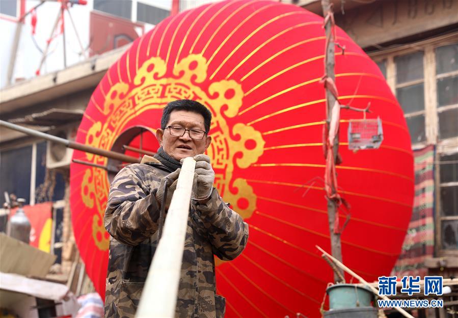 在河北省石家庄市藁城区屯头村,白军平在挑选制作灯笼的竹竿(1月10日摄)。 新华社发(梁子栋 摄)